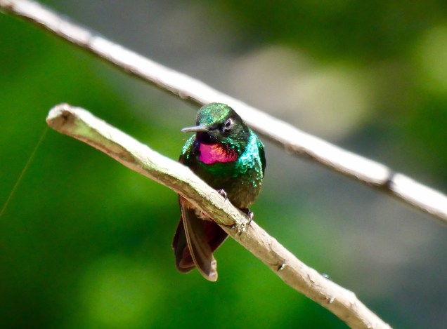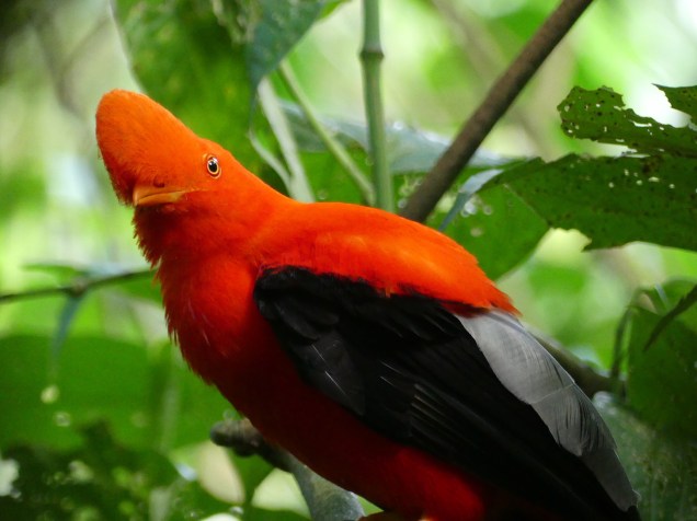 For birdwatchers, Jardín contains one final big treat. Down by the river, and in the gardens of a local house, around 15-20 “gallitos del roca” come to lek every morning and afternoon These bright red and extraordinarily crested male birds announce their appearance with a grating screech, and proceed to bow, bob and flap at each other in a show of macho pride they hope will win them the attention of the rather more discreetly plumaged female (I briefly spot one lurking across the river discreetly checking out the action). They’re like a little wonder of the world in their own right. I’ve posted a little video clip for you to enjoy here!
