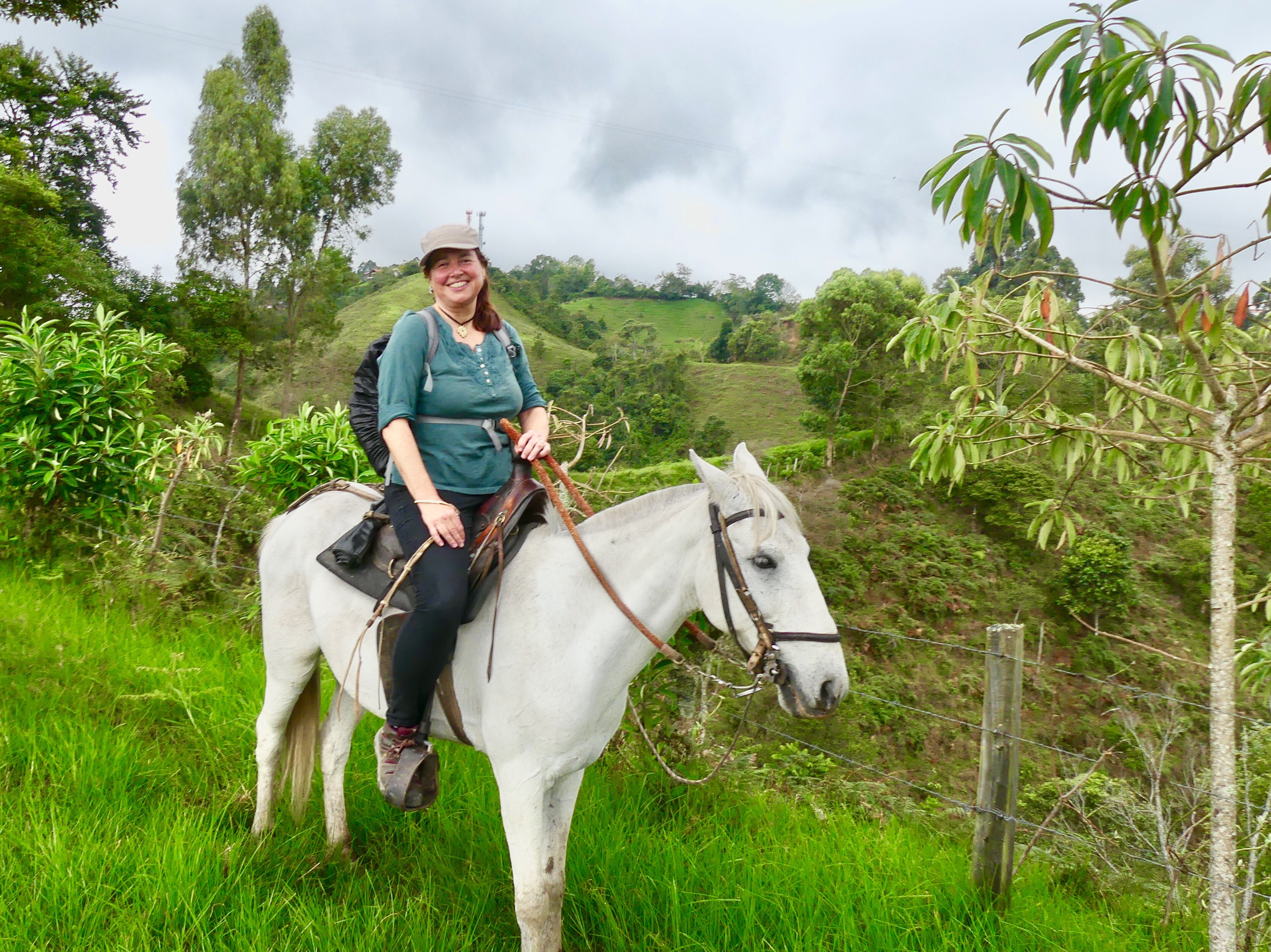 It was in Salento too that I got on a horse for about the third time in my life, under the charming guidance of Señor Delio, who was the embodiment of chivalry. My horse, a grey called Muñeco (puppet), insisted on being in the lead the whole way through the town, along a narrow ridge, down a zigzagging tiny track so steep we had to almost stand in the stirrups so as not to go over the horse’s head! Crossing the first river was also a nail biter for this amateur rider as Muñeco carefully picked his way into the belly-deep current and scrambled to the other bank – the next two shallower rivers were tame by comparison! We trotted and splashed through streams, muddy fields to a pretty waterfall. The heavens opened on the way back, but Señor Delio had us covered with huge thick plastic ponchos.
