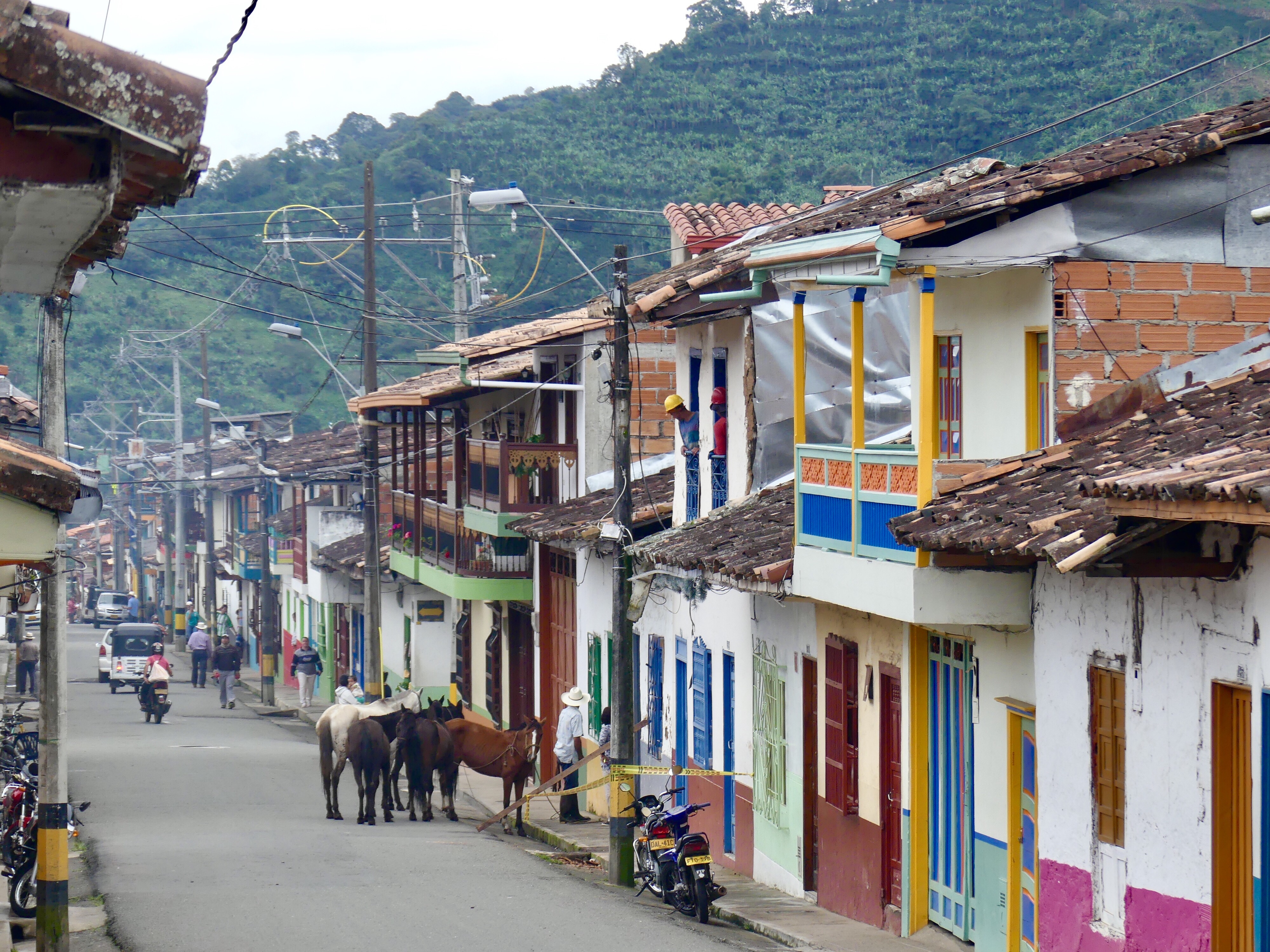 I’m almost reluctant to include Jardín in this blog, because it’s one of those true charmingly hidden gems and a slice of Colombian life you don’t want everyone to know about in case it gets become spoiled by tourism! It’s dark when we arrive, but the town square is alive with food stalls, bars, music playing and people sitting around the brightly painted wood-clad houses with beers, coffees, rum and aguardiente. There is a relaxed sense of pride in this place, reflected in the spotlessly clean streets and multicoloured paint, decorations and flowers of the houses that just makes you want to smile. People here both work hard and play hard. At 5.30 am the streets are already busy with people heading off to farms and construction site in their wellies, opening up the cafés for the morning ‘tinto’ (sweet black coffee shot) or climbing into buses to nearby towns, or washing their doorsteps. You can take tiny cage like cable cars to lift you over the river and up the hills surrounding this town nestling in the valley, and there are plenty of offers of horse rides to local waterfalls, although the most famous cascade in a cave is closed off due to recent landslides. Towards late afternoon, as the sun is going down, groups of men in crisp shirts and wide brimmed hats, and women in equally pristine outfits, gather in the painted seats around the colourful edges of the main square, watching the world go by, sharing the day’s news over afternoon tea or fresh juices, as the ‘carritos’ set up stall selling chicken, pork and a wide selection of deep fried empanadas and sweet pastries. It’s at this time that horses start appearing in the streets of the squares, prancing past in a bouncing trot, their riders practising for monthly local competitions.