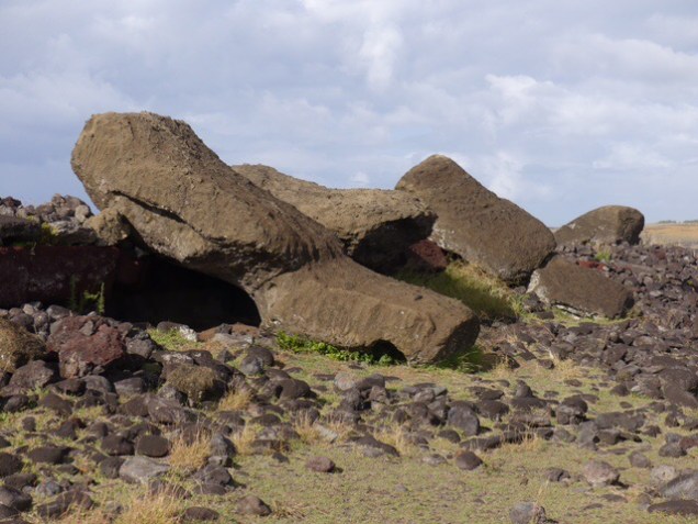 The carving of statues to honour your ancestors, so that their spirit continues to protect the tribe is known throughout Polynesia. Here on Easter Island that practice seemed to reach epic proportions as different tribes sought to show off their relative power, amidst increasingly constrained resources. When a chief died, statues were commissioned from the volcanic quarry at Rano Raraku, where hard basalt rock provided the tools, and softer compacted ash-volcanic rock the materials. The statues were then transported over land, probably upright, which is why the legend (and some people’s grandparents today!) says they walked, and many of them toppled and broke along the way – toppled moai are dotted all around the island. Arriving at the villages, the statues were erected on ceremonial ‘ahu’ or great stone platforms, with the tomb of the dead chief below. The final touches were added on-site, sometimes coral eyes and a red rock topknot representing hair (not a hat!), separately carved and transported from a completely different quarry at Puna Pau. Statues always faced into the village, to look over the people, and not out to sea, as some artists depicted. The whole process probably took a year to complete and carbon dating shows the statues becoming increasingly large and elaborate, with neck, stomach and back tattoos added to the designs.